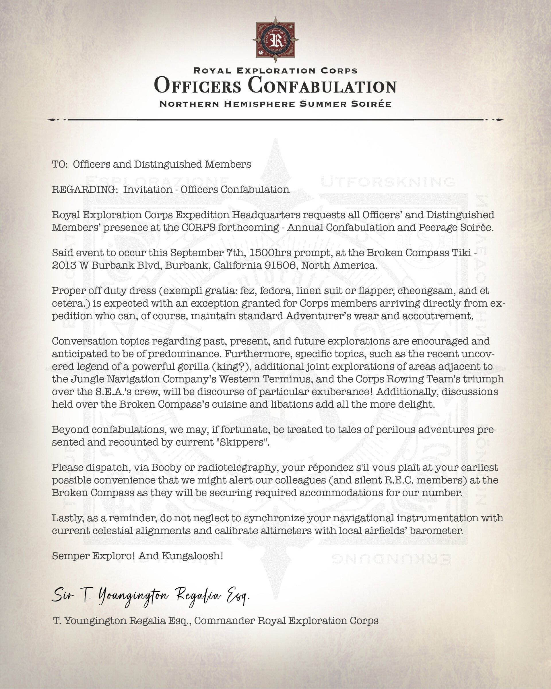 Royal Exploration Corps Expedition Headquarters requests all Officers’ and Distinguished Members’ presence at the CORPS forthcoming - Annual Confabulation and Peerage Soirée. Said event to occur this September 7th, 1500hrs prompt, at the Broken Compass Tiki - 2013 W Burbank Blvd, Burbank, California 91506, North America.